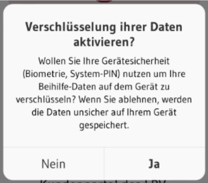 Seit dem Update der App im Januar 2024 ist ein neues Sicherheitsmerkmal vorhanden, durch welches Ihre Daten in der App zusätzlich verschlüsselt werden. Bei der ersten Nutzung der App nach der Aktualisierung sind Sie gefragt worden, ob Sie dieses zusätzliche Sicherheitsmerkmal nutzen möchten:
